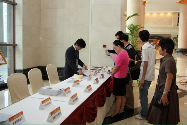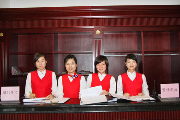 会务组在前台发放会议资料,并答询客人有关会议情况咨询,显得井井有条、方便周到。