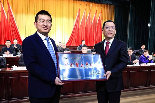 大会对全市有突出贡献的、发展快的、质态好的企业进行了星级评定和表彰。铜陵海螺再度荣获“铜陵市特别重大贡献奖”和“五星级企业”荣誉称号。公司总经理刘庆新同志代表公司接受丁纯书记现场授牌。
