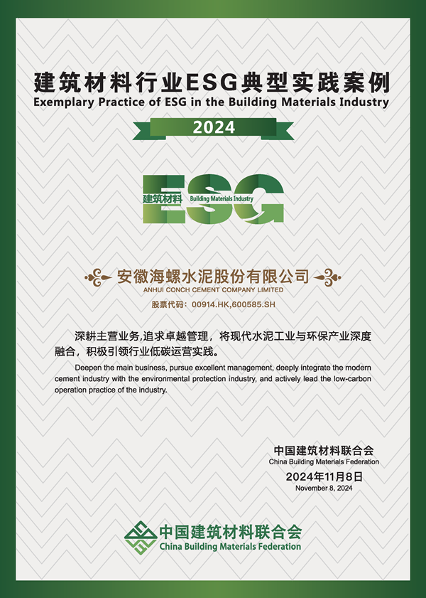 On November 13-14, China Building Materials Federation held the 2024 annual building materials industry conference in Beijing, at which the ESG development research report of China Building Materials industry (2024) and typical cases were released. Conch Cement was successfully selected as the "2024 annual ESG typical practice case of building materials industry" by virtue of its excellent practice in ESG.