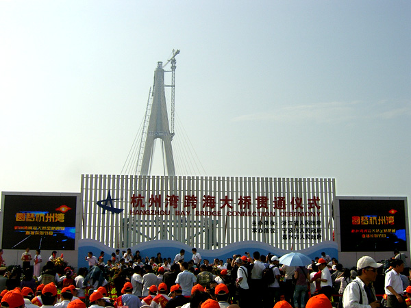 The ceremony scene of The Hangzhou Bay Cross Sea Bridge entirely linked up.