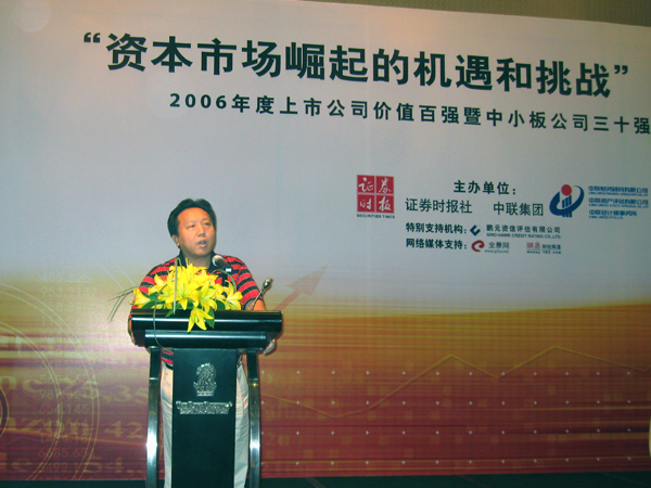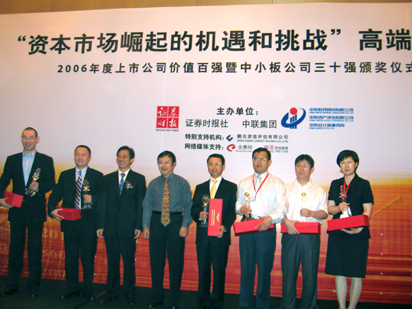 Evaluation activity of "China top 100 most valuable listed company on the main market and top 30 most valuable listed company on medium and small market in 2006” jointly sponsored by the China United Group and Securities Times.The awarded ceremony of evaluation result held in the Rezi-Carlton Hotel located in Finance Street in Beijing on June 29, 2007.Nearly one hundred listed enterprises including China Merchants Bank, Vanke , China International Marine Containers(group)Ltd, Conch Cement ,as well as Mr.Wang Zilin,the board chairman of China United Group, Mr.Wen Zijian,proprieter of Securities Times, well-known economist Mr.Liu Jipeng, Mr.Wu Xiaoqiu,international cooperation department leader of China Securities Regulatory Commission, Mr. Xiao Lijian, vice- superintendent of research institute of Shenzhen Stock Exchange, Mr. Yue Gongxia, deputy secretary-generals of the China Appraisal Society attended the awarded ceremony. Attendees made the lecture of rising opportunity and challenge on Chinese capital market.