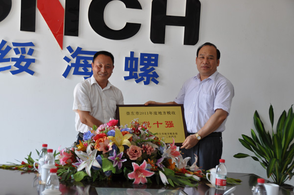 Chongzuo Municipal Local Tax Bureau awarded the honorable title of “Top Ten for Ratepaying” enterprise in Chongzuo City to Fusui Conch. All the time, Fusui Conch take the principle of creditable operation, actively fulfill obligation of tax paying and totally hand over the tax of RMB 200 Mm making outstanding contribution for the local economic development.
