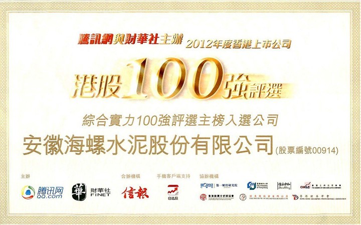December 5, 2012, “Top 100 Listed Companies in Hongkong” has been published by FINET and Tencent. Conch Cement has ranked into “Comprehensive Strength Top 100 ” in main list and topped as No. 27.