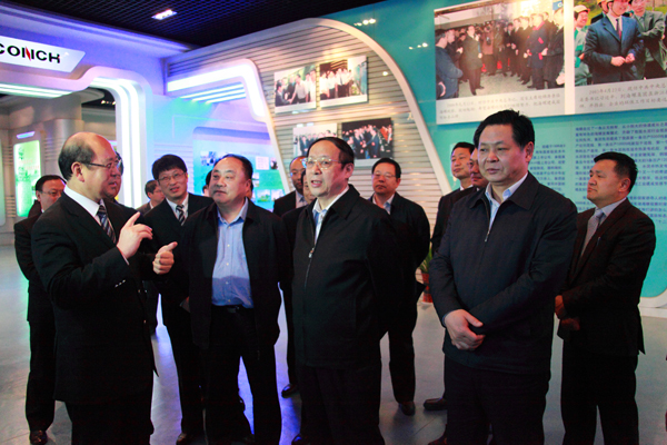 Mr. Wang Xuejun, the deputy secretary of the CPC Anhui provincial committee and acting governor of Anhui province, led a delegation to visit Conch Group on April 13th, 2013. They visited exhibition hall of Conch and the energy conservation equipment manufacturing base, focusing mainly on the development of Conch’s business and overseas investment project in recent years as well as the energy conservation equipment industry.(translator:Wangshan)
