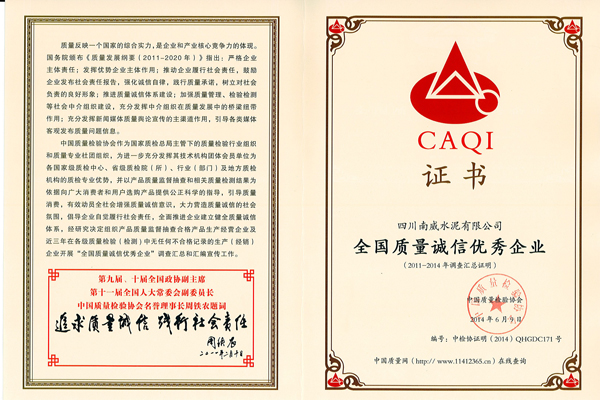 On 18th, June 2014, Nanwei Cement Company was honored “National excellent enterprise with integrity and good quality” by Chinese Association of Quality Inspection.(translator:Huxiaohong)
