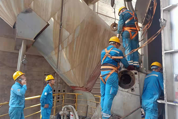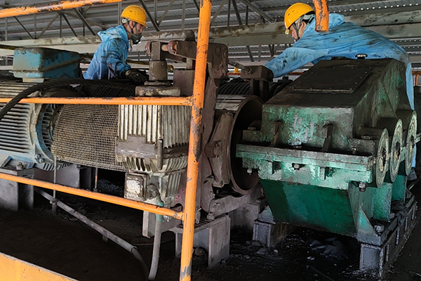 原料磨磨辊更换作业现场,一股热浪铺面而来,然而这群可敬的维修作业人员没有躲散,依旧顶着烈日炙烤兢兢业业的工作,汗水早已湿透了工作服,但依然干劲不减。有了这群可敬的维修人员,在日常工作中的辛勤付出,各个设备才得以安全、有序运行。