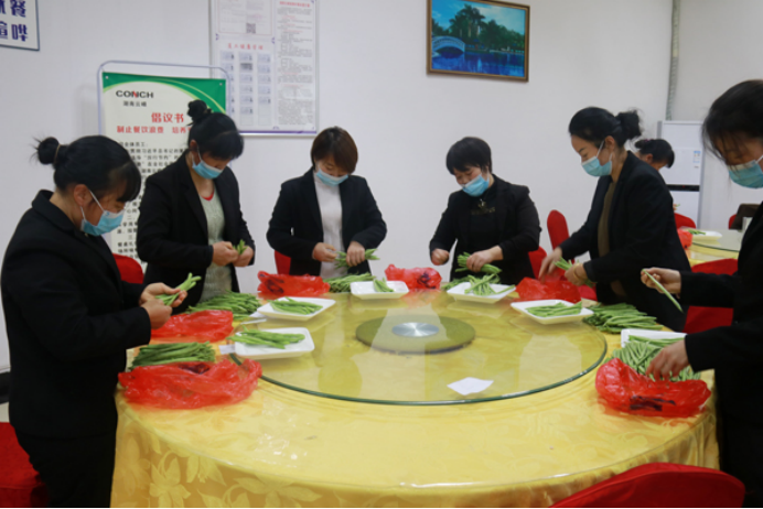 首先,开展的是后勤服务员择豆角比赛。服务员择相等数量的豆角,评委根据完成速度、操作过程熟练度、四季豆毛重等方面对各服务员进行打分。