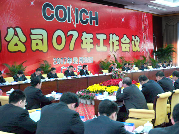 元月29日上午8时整,公司2007年工作会议按期在英德海螺国际大酒店召开。参加这次会议的有公司领导、部室与各子公司负责人220多人,英德海螺水泥公司等企业部分中层骨干列席会议。 本会由郭文叁董事长主持。 上午的会议主要传达中央经济工作会议精神以及郭金龙书记、王金山省长的讲话。会上,报告了公司2006年财务运行状况,对公司 “十一五”期间的发展战略进行了部署。