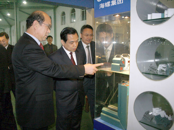 郭文叁董事长陪同中信重机集团公司任总参观芜湖海螺型材公司产品展区
