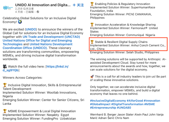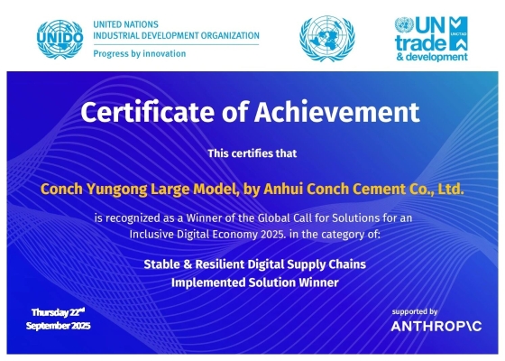 近日,海螺集团下属“安徽海螺水泥股份有限公司——海螺云工大模型”在联合国工业发展组织等机构于2025年7月发起的“2025包容性数字经济全球解决方案征集”中,荣获: 稳定与韧性的数字供应链 类别 最佳实施方案奖 奖项。