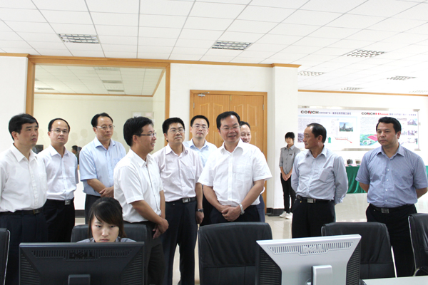 在公司领导陪同下,潘市长一行参观了中央控制室。阎加军通过宣传展板向潘市长一行简要介绍了集团公司的基本情况以及弋阳海螺公司生产规模、发展历程及生产经营近况,重点介绍了公司在创造税收、节能环保等方面取得的佳绩。结合中控操作画面,阎加军向潘市长一行简要介绍了水泥生产工艺流程、主要污染物控制操作技术和在线监测系统运行情况。