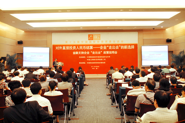 9日上午,金融支持企业“走出去”政策说明会在厦门国际会议中心召开,此次政策说明会的主题是“对外直接投资人民币结算——企业走出去的新选择”。会议围绕满足走出去企业了解和使用人民币到境外直接投资的需求,重点宣传和推介了境外人民币直接投资方式。