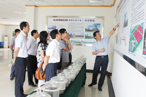 在参观中控室过程中,研究所成员刚走进中控室,就迫不及待地观看生产监控视频,并兴致勃勃地询问视频显示内容、新型干法水泥与传统立窑水泥对比等问题,并用相机拍摄了余热发电及水泥工艺流程宣传展板。周正友针对研究所成员的提问给予了详细地答复,并通过CIS宣传展板、展台展品等详细介绍了新型干法水泥熟料生产工艺流程、工业废弃物利用情况及垃圾焚烧项目。