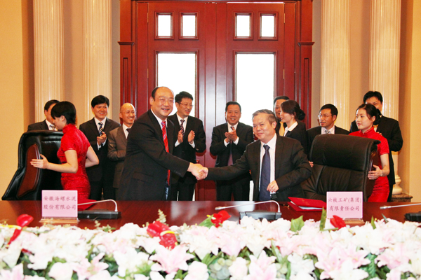10月14日,集团公司总经理任勇率对外经济合作部等相关部门负责人与六枝工矿集团就项目合作的细节进行了详细沟通,并达成合作共识。下午15:28分,双方在弋江国际会议中心六楼东海厅正式签约,标志着海螺水泥成功控股贵州六矿瑞安水泥有限公司。
