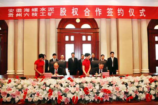 2011年10月14日,安徽海螺水泥股份有限公司和六枝工矿(集团)有限责任公司股权合作签约仪式在芜湖弋江国际会议中心隆重举行。海螺集团总经理任勇以及相关部室负责人,贵州盘江煤电集团总经理助理尹立、六枝工矿集团副总经理周东,贵州六矿瑞安水泥总经理黄澍等出席签约仪式。海螺集团副总会计师、海螺水泥对外经济合作部副部长丁锋、六枝工矿副董事长、党委书记、总经理施文刚代表双方公司共同在股权合作协议上签字。