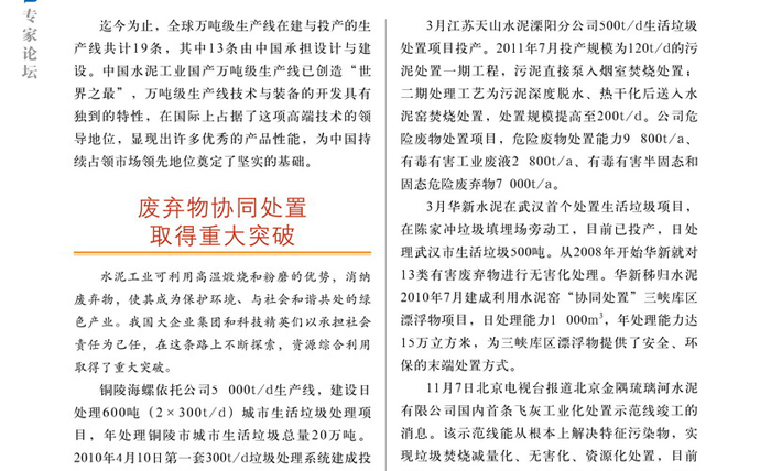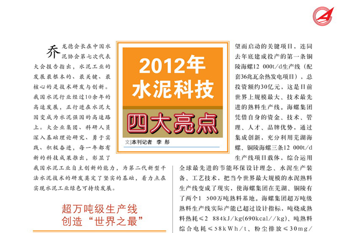 2013年1月1日出刊的协会《中国水泥》杂志,梳理了我国水泥行业十余年高速发展取得的重大科技成果,并盘点出“2012年水泥科技四大亮点”。海螺集团的超万吨水泥熟料水泥生产线和利用水泥窑协同处置城市生活垃圾两项技术开发与创新成果成为2012年行业科技创新的两大亮点。