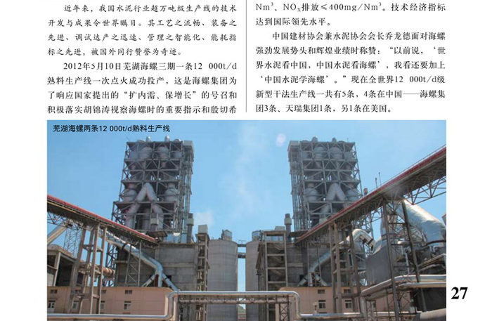 海螺集团凭借自身的资金、技术、管理、人才、品牌优势,通过集成创新,充分利用芜湖海螺、铜陵海螺三条12 000t/d生产线项目载体,综合运用全球最先进的节能环保设计理念、水泥生产装备、工艺技术,把当今世界最大规模的水泥熟料生产线变成了现实,使海螺集团在芜湖、铜陵有了两个1500万吨熟料基地。海螺集团超万吨级熟料生产线实际产能已超过设计指标,吨烧成熟料热耗、吨熟料综合电耗、粉尘排放、NOX排放等技术经济指标达到国际领先水平。