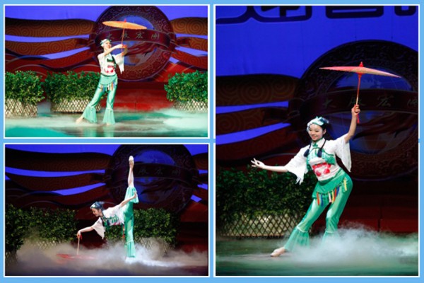 浙江区域舞蹈《月亮湾》呈现出具有江南特色的含蓄、清爽、耐人寻味的旋律和画面,展现了海螺儿女的一片柔情。绿色扇面连成的波浪,描绘了最美的月夜星空。
