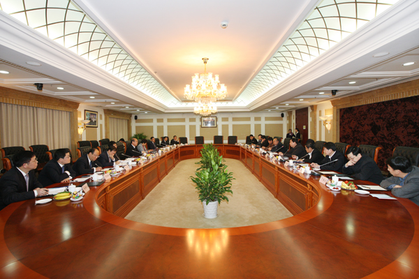 2013年2月26日,甘肃省国资委主任马艾武,酒钢集团董事长冯杰,甘肃省国资委副主任车洪,甘肃省嘉裕关市委常委、常务副市长杨伟等一行11人,在安徽省国资委总会计师、党委委员江燕和省国资委监事会主席董亚庆等陪同下来海螺集团考察交流。集团公司董事长郭文叁率集团领导任勇、纪勤应、齐生立、丁锋、张昇以及相关部门负责人热情接待了考察团。