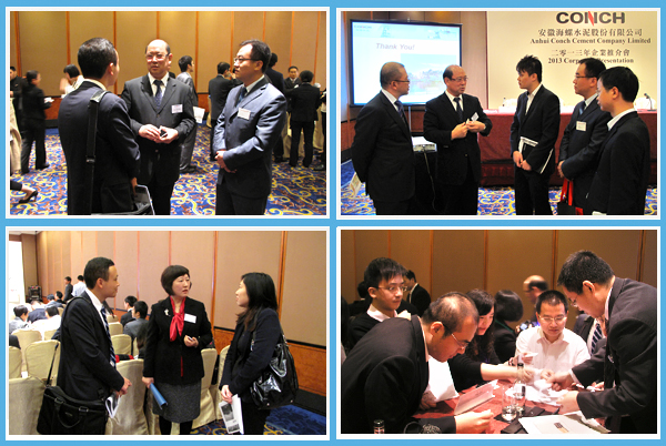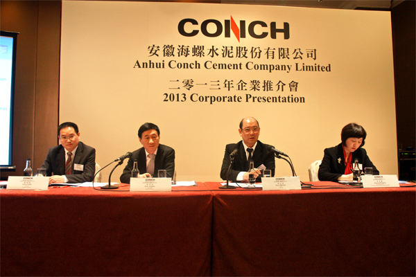 2013年3月26日上午,海螺水泥在香港万豪酒店举行2012年度业绩推介会议。公司董事长郭文叁、执行董事郭景彬、执行董事兼副总经理章明静、副总会计师夏小平、董事会秘书杨开发等人出席,160余名投资者和分析员前来参会。推介会现场座无虚席,气氛活跃。