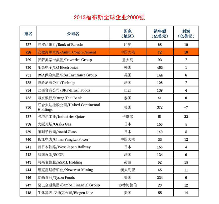 从今年《福布斯》中文版(2013年5月下)期刊上获悉,海螺水泥再度入选《福布斯》2013全球企业2000强榜单,名列第728位,较2012年上升208位。