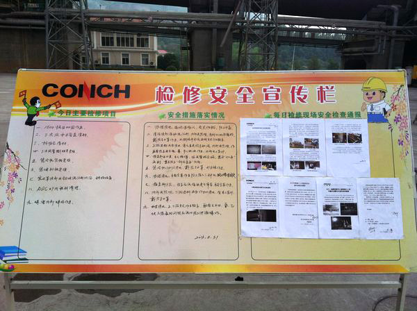 建德海螺:公司以安全生产月活动为契机,强化安全管理。一方面精心策划安全月活动方案并组织实施,另一方面以1#窑检修安全管理为抓手,通过“检查、参加安全早会、核对检修项目停送电办理、跟踪监督危险作业防护、外委单位施工安全监管、检修现场作业行为规范、违章违纪通报及晚会安全提醒”等七方面扎实开展安全管理工作。在抓好检修安全的同时,生产安全处注重创新安全管理,检修前制作了以“遵章守纪 文明检修 安全检修”为主题的宣传横幅在一线窑中悬挂以营造安全管理氛围。在检修指挥部制作了“检修安全宣传栏”,对当日主要检修项目进行了较为详细的安全防护交底,并将前日检修安全检查通报和违章处理通报张贴在宣传栏上,起到了良好的宣传和警示作用。