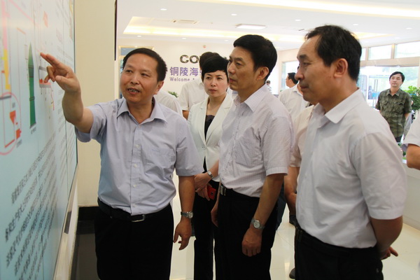 2013年6月26日下午,安徽省人大常委会秘书长朱读稳率省人大“一法一条例”执法检查组一行14人来铜陵海螺检查氮氧化物减排和垃圾处理情况,铜陵市人大常委会副主任何刚明、常务副市长江娅等领导陪同检查,海螺水泥股份公司总经理助理李群峰、工艺总工程师李乐意、生产调度中心主任傅永志、铜陵海螺公司党委书记刘宏春、副总经理程小兵热情接待了检查组一行。