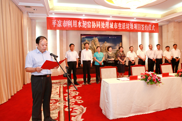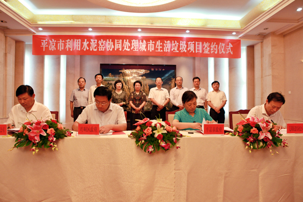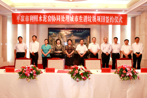 2013年8月29日下午,平凉市崆峒区人民政府、芜湖海创实业有限责任公司、平凉海螺水泥公司在甘肃省平凉市平凉宾馆正式签署了《平凉市利用水泥窑协同处理城市生活垃圾项目合作协议》,平凉市人民政府鉴证签约。平凉市委书记陈伟,市长臧秋华,市委常委、崆峒区委书记王大睿,副市长杨军,市政府秘书长王锦,崆峒区区长赵小林,芜湖海创实业有限责任公司总经理纪勤应,海螺水泥公司执行董事章明静,海螺集团公司总经理助理、海螺水泥对外经济发展部部长丁锋,海螺水泥陕甘区域委员会主任陈永波,海川工程公司常务副总经理李大明,平凉海螺公司总经理秦宏基,平凉市、崆峒区两级发改委、工信委、财政局、环保局、招商局主要负责人共约60人参加了签约仪式。