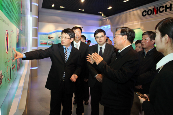来到技术创新和节能减排展厅,任勇总经理介绍了海螺通过科技创新,引领中国水泥工业的技术进步,实现装备的低投资、国产化以及节能环保产业发展等情况。陆浩同志听后感慨地说:“海螺是中国民族工业的脊梁,贡献大。”