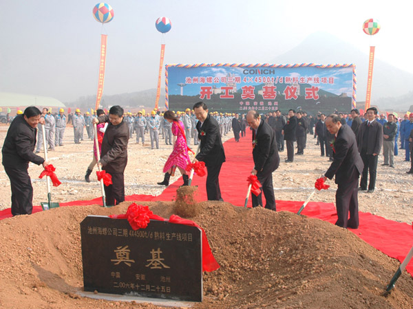 2006年12月25日上午,池州海螺水泥公司三期项目现场彩旗招展,喜气洋洋,公司三期项目奠基仪式在这里隆重举行。省委常委、常务副省长孙志刚,省政府副秘书长张秋保、省发改委主任沈卫国,省国土资源厅副厅长项怀顺,池州市长方西屏,市人大常务副主任朱永能,市政协主席程铭义,副书记孙晓福及朱四德、陈冰冰、施永春、周春桂等市领导,海螺水泥股份公司董事长郭文叁等公司领导,相关部室、兄弟子公司、施工单位领导及池州海螺部分员工出席了奠基仪式。