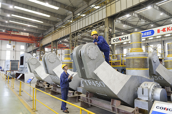 7月24日,海螺集团芜湖节能装备制造基地的工人在检测准备出口的高效节能立磨组件。海螺集团抓住“一带一路”战略机遇,加速水泥项目“走出去”步伐,“足迹”从印尼到缅甸、老挝、柬埔寨等国。 1月至6月,海螺水泥装备及配套节能环保设备出口金额达66885万元,同比增长约58.7%。(记者 沈宫石 李博 摄)