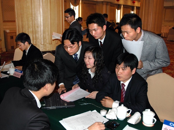 几个同学组合着分析、判断企业提供的资料,达到聚精会神的程度