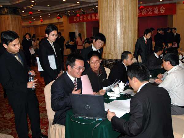 4月2日,公司2007年高校毕业生双向选择洽谈会在最后一天达到高潮,前来参加洽谈会的有120人,为三天来最多,涉及财务会计、市场营销、物资管理、人力资源、企业管理和文秘等多个专业。洽谈会现场熙来攘往,气氛异常活跃。尽管前来应聘毕业生多,涉及专业杂,但因为分工合理,准备充分,洽谈会从复试登记到组织专业测试,再到毕业生与用人单位洽谈,双方填写需求志愿等等,一系列流程组织得井然有序,有条不紊。全部专业测试及双向选择洽谈结束后,公司人力资源部遵照用人单位和毕业生双方的意愿,进行合理调配,达到人力资源的最佳配置。当天又有95名高校毕业生与公司达成就业协议,光荣加盟海螺集团。