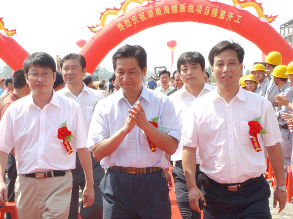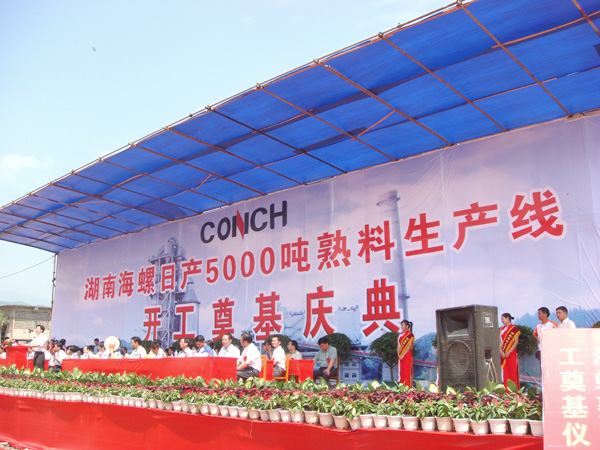 7月28日上午10时38分,在湖南海螺水泥有限公司内原四条湿法线的场地上,乐曲高奏、彩旗飘扬,湖南海螺日产5000吨熟料生产线开工奠基庆典隆重举行。中共娄底市委书记蔡力峰,市委常委、秘书长张定良,副市长邓建和、王善明,市各部门负责人,新化县四大班子全体成员等市、县有关领导;海螺集团副总经理、海螺水泥股份公司总经理任勇,海螺水泥股份公司副总经理、湖南海螺公司董事长汪鹏飞等领导,湖南海螺干部员工、周边镇村代表600多人参加了开工奠基仪式。