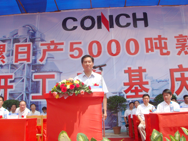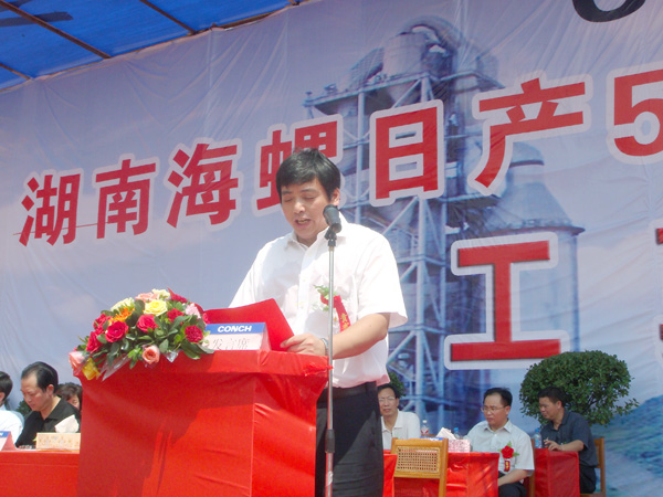 海螺水泥股份公司总经理任勇同志受郭文叁董事长委托,在仪式上讲话。代表海螺向出席仪式的各界领导表示热烈的欢迎,并向长期关心、支持海螺发展的社会各界表示衷心的感谢。他说,自海螺2003年正式进入湖南省发展以来,在各级政府的高度重视和大力支持下,水泥主业在湖南省内的拓展初见成效,为中部崛起战略的实施、为地方经济发展做出了贡献。湖南海螺扩建日产5000吨熟料生产线项目,是在拆除原有四条湿法生产线的基础上,利用原址,就地改造建设新型干法熟料生产线。相信在省、市、县各级政府和有关部门的大力支持下,湖南海螺熟料生产线项目一定能如期建成并发挥效益,为坚持科学发展、构建和谐湖南、加快富民强省做出更新、更大的贡献。