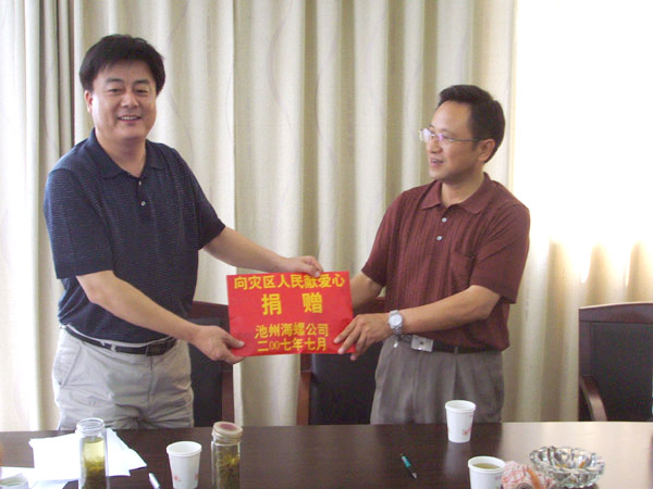 截止到7月31日上午10时,池州海螺公司广大干部员工自发募捐万余元,7月31日下午,公司工会主席陈其安同志代表池州海螺公司将募捐款送到了贵池区民政局,向灾区人民献上了爱心。(文/图 陈锡云)