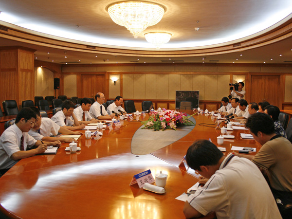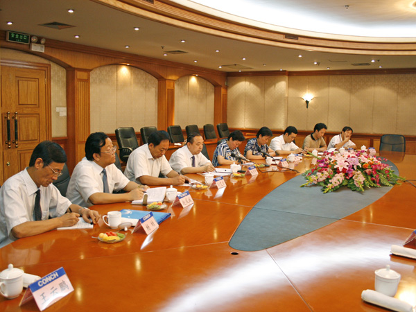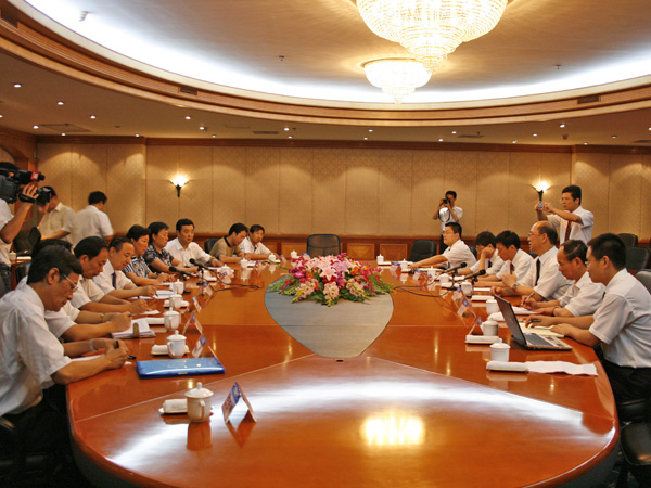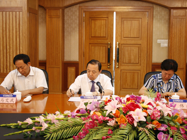 郭文叁董事长对杨志明副省长率团专程来海螺考察表示热烈欢迎,并概要介绍集团十年来改革与发展的历程