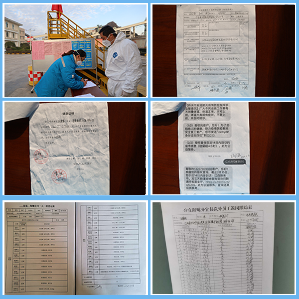 落实返岗员工排查,阻断疫情传播。分宜海螺现有员工468人,其中85%属分宜本地员工,主要居住在县城。为保障疫情期间的人员管理防控,公司通过手机用户轨迹查询法进行提前摸底排查,复岗员工必须是非疫区回来人员或本地已居家隔离14天人员。对于春节离开分宜返回公司的员工,公司贴心地安排隔离宿舍,并由专人送餐,14天无恙后方可正常上班,第一次复岗人员填写“员工返岗登记表,建立公司一人一档登记表。由部门领导、总经办、安环处复查体温及复岗手续方可上班。