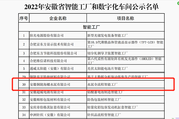 日前,安徽省经济和信息化厅网站发布了2022年安徽省智能工厂和数字化车间名单公示,评定省内36个项目为安徽省智能工厂。安徽铜陵海螺水泥有限公司水泥全流程智能工厂入选其中,被评为“2022年安徽省智能工厂”。