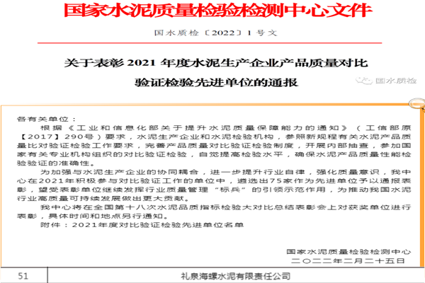 近期,国家水泥质量检验检测中心表彰了2021年度水泥生产企业产品质量对比验证检验先进单位,其中礼泉海螺榜上有名!