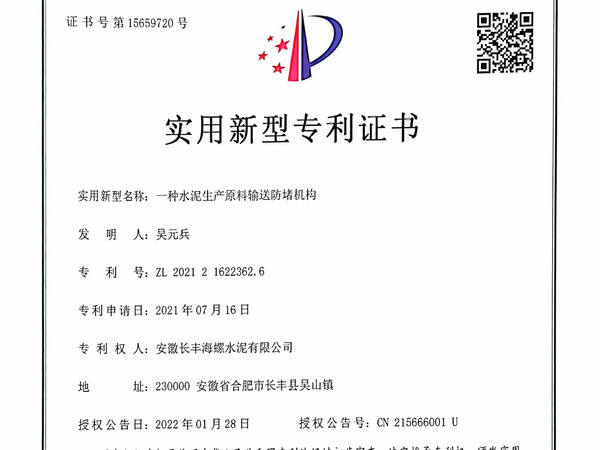 近日,长丰海螺科技创新工作喜获佳绩,2021年组织申报的“一种水泥生产原料输送防堵机构”实用新型专利正式获国家知识产权局授权。