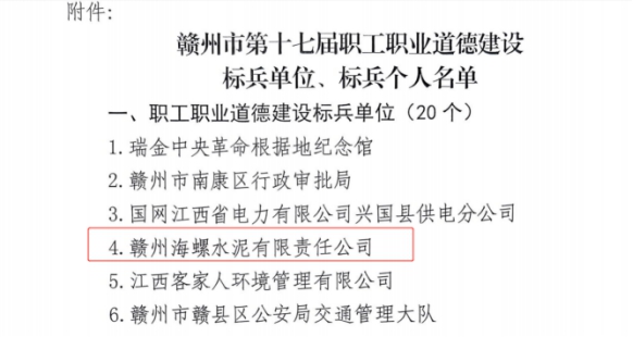 4月11日,赣州市总工会发布了《关于命名第十七届全市职工职业道德建设标兵单位、标兵个人的通报》,赣州海螺被命名为“赣州市第十七届职工职业道德建设标兵单位”,名列全市20个获命名单位第4位,是信丰县本次唯一获评单位。