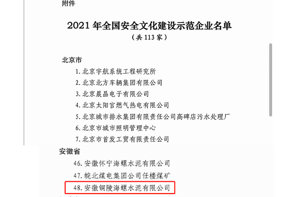 日前,中国安全生产协会发布了《关于命名2021年全国安全文化建设示范企业的公示》,安徽铜陵海螺水泥有限公司顺利通过评审,被授予“全国安全文化建设示范企业”称号。