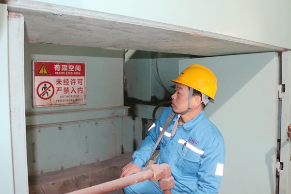 在这之后,孙林通的目光和脚步,先后三次回到这个位置。他俯身观察,对比记录,确认渗水量虽然很小,但却在持续地增加。他深知任何的疏忽或侥幸,都可能让隐患在“再观察一下”的拖延中升级。清晨六点,当渗水现象已转为清晰可见的细流时,孙林通果断拿起对讲机,向上级进行了清晰、准确地汇报:“4#辊压机动辊有载端渗水加剧,疑似内部构件异常,请设备人员立即现场确认!”
