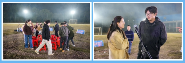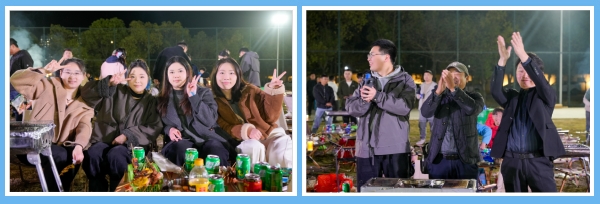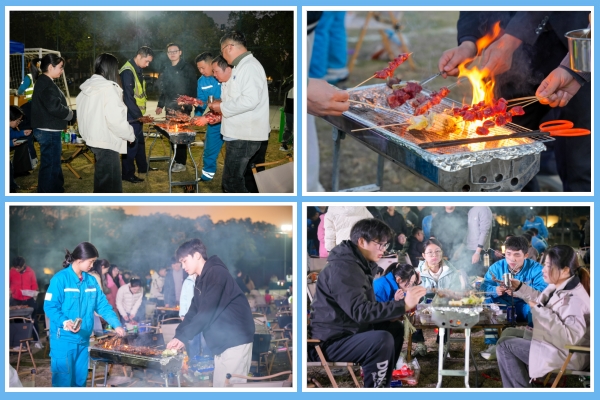 你看这边的烧烤区,虽伴着冬季傍晚的微凉,却处处洋溢着火热的气息。员工们自发组成烧烤小队,分工协作、默契配合,有人熟练翻转,精心控制火候让食材能够达到最佳风味;有人热情分发调料和饮品,不时挥舞着荧光棒配合乐队的演出节奏。平时忙于各自岗位的员工都在此刻化身为“烧烤大师”,在炊烟袅袅与欢声笑语中,彼此间的距离迅速拉近,交流也变得自然而融洽。