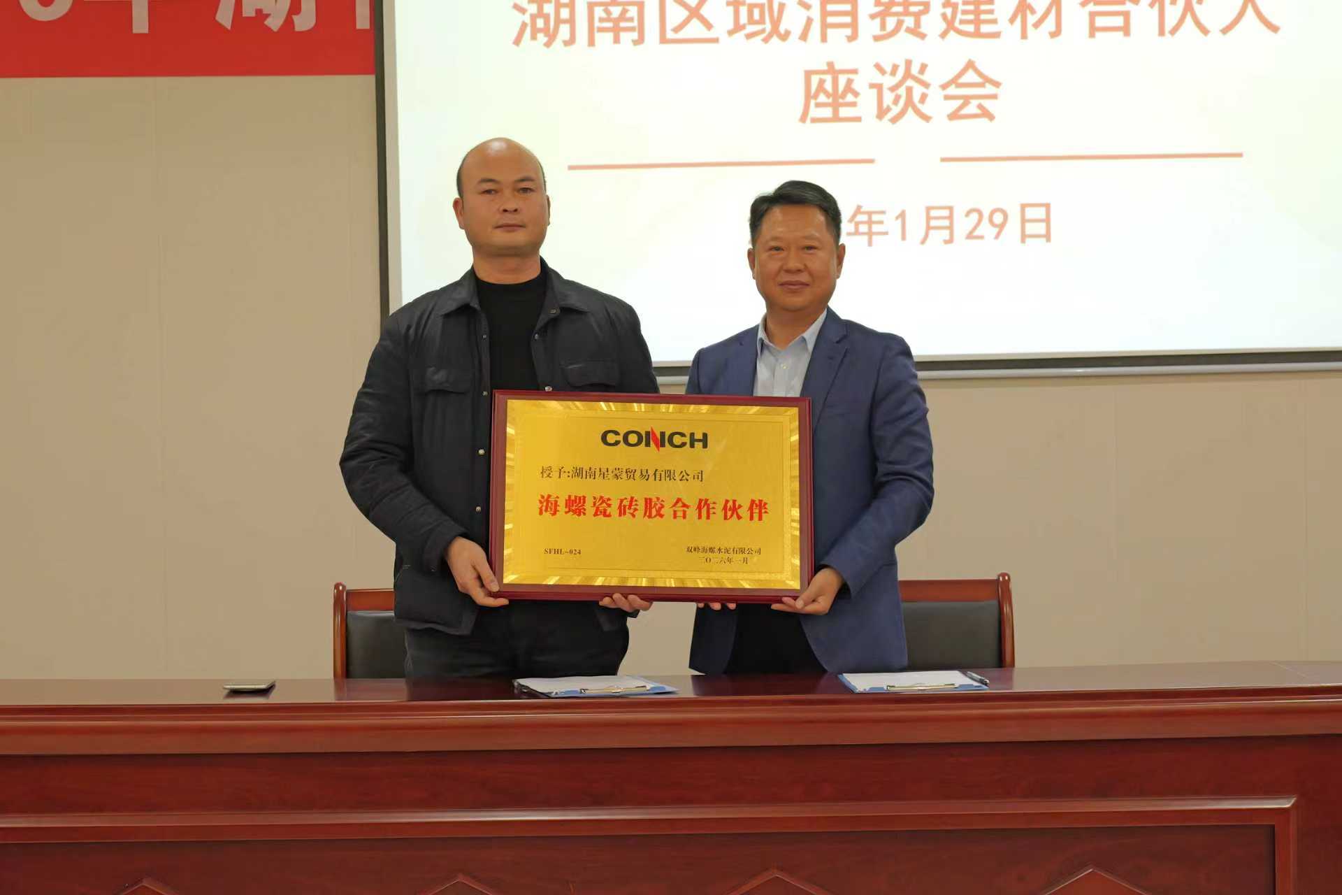 双峰海螺总经理王武、湖南区域销售专业组组长李超与消费建材合伙人进行了签约与授牌,对2025年工作开展突出的合伙人进行了表彰。