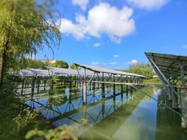 在楚州海螺人工湖旁,整齐连片的光伏板“镶嵌”在蓝天碧水之间,与绿意盎然的自然风光巧妙融合,形成了一道别样的风景。