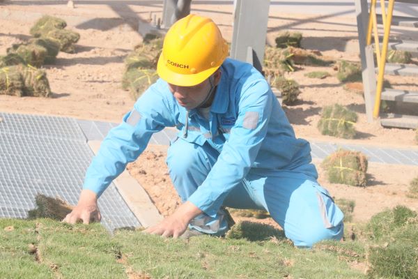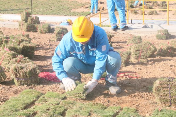 活动现场中,大家有条不紊地进行场地清理,清除碎石,对铺设区域进行翻耕,打碎土块、平整地面,铺设草皮。在大家的共同努力下,一块块草皮紧密衔接,构建出一道致密的生态护坡,让现场环境焕然一新,一抹抹绿色映入眼帘,为早春厂区增添了一抹盎然生机。