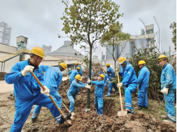 上午9点,植树现场已是一派繁忙景象。公司各级管理人员带头示范,员工们分工协作、默契配合——挥锹铲土、扶树填坑、踏土夯实、提水浇灌,形成“挖掘—搬运—定植”的高效流水线。“坑要挖深一些,土要踩实,水要浇透,这样才能保证成活率。”经验丰富的老员工,手把手向年轻同事传授植树技巧。年轻员工边学边干,虚心请教,在老同志的指导下逐渐从生疏到熟练,一天内就完成80余棵樟树、橘子树种栽任务。