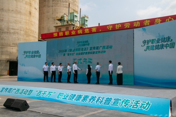 2026年4月24日,2026年《职业病防治法》宣传周广西活动暨“百千万”职业健康素养科普宣传活动启动仪式在扶绥海螺二期包装发运广场隆重举行。本次活动由广西自治区卫生健康委员会主办,崇左市卫健委、扶绥县人民政府及扶绥海螺共同承办,自治区、市、县相关领导及企业负责人、职业健康管理员、职工代表等齐聚现场,共推职业健康事业发展。